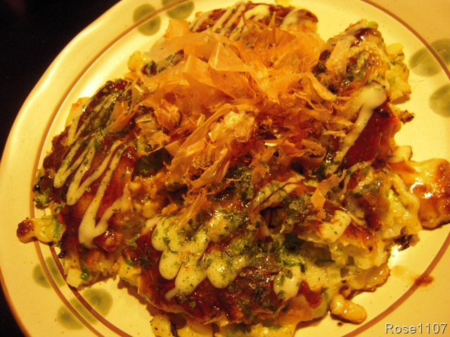 青蔥大阪燒>,綜合的食材有豬肉.花枝和蝦仁;另外一種口味有豐富的