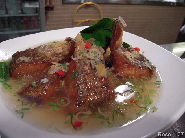 <香茅酥炸魚>鱸魚片下鍋酥炸後,淋上以香茅.檸檬葉.南薑.檸檬汁.